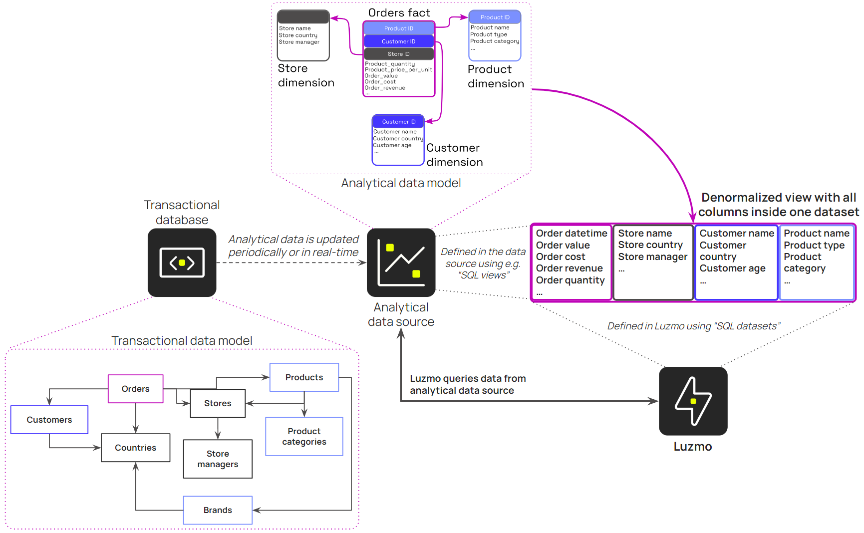 Denormalized views simplify the data structure by flattening it into a more accessible format, empowering business users to create dashboards and reports efficiently in BI tools like Luzmo. This approach reduces the need for complex joins, allowing less technical dashboard designers to work with the data without needing in-depth knowledge of where specific data resides. You can create these denormalized views in your data source, or use the SQL datasets functionality in Luzmo to define them on the fly!