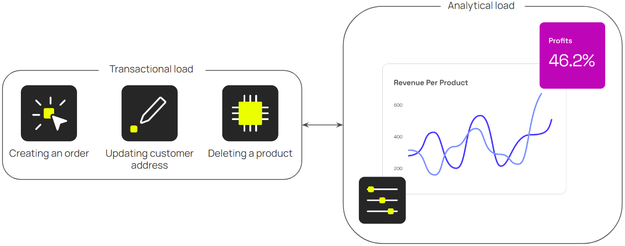 While analytical loads (OLAP or Online Analytical Processing) focus on analyzing a small subset of columns across a large number of rows (e.g. summing numeric values from a column, grouped by a category column, and filtered by a date column).