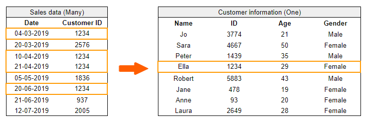 Datasets must be linked through a common column. In our example, the datasets are linked through the customer ID, since this ID occurs in both datasets. Sets without a common column can’t be linked. The values of that common column must be exactly the same in both datasets including spaces and capital letters. This is important when you work with customer names for example. The column names may differ between datasets, since those are not used as values in the charts.
