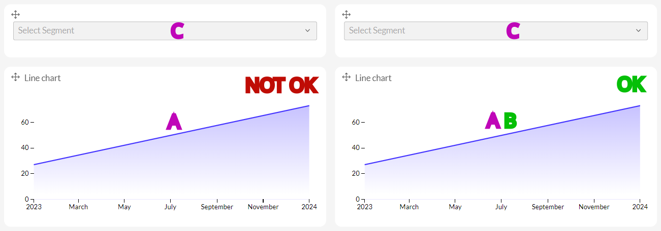 However, to obtain linked filtering in your dashboard, the data must be linked directly. There is no problem when you want to apply this to datasets A and B, or B and C. However, if you want to filter on set C and affect set A, dataset B must also be involved in the chart. That is because set B makes the link between set A and set C.