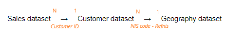 Since the Sales dataset and our Geography datasets don’t have a common column and can’t be linked, we need to use the Customer dataset to make the link between them. In the Customer set is a column called 'Country' which can be linked with the column ‘Formal name’ in our geography dataset. Our three datasets will be linked as follows: