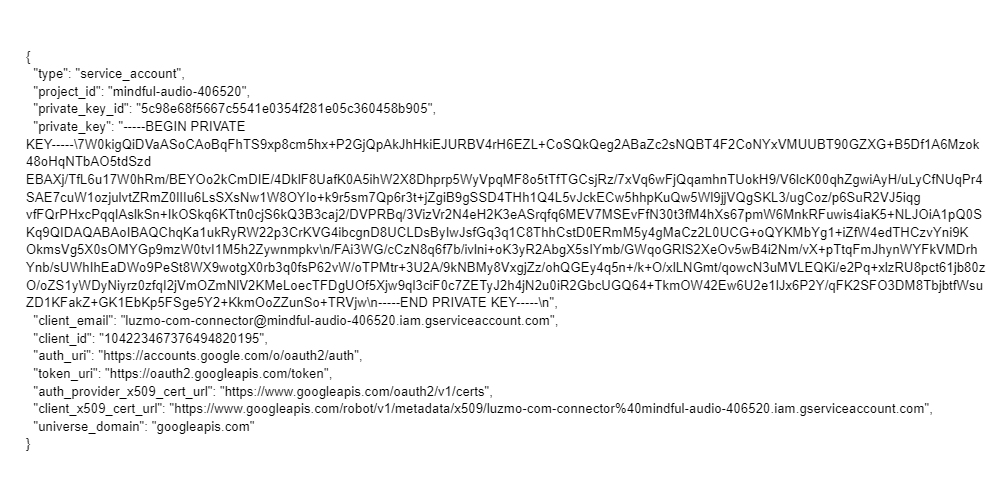 Once created, you can then download a JSON with the credentials (the following example is not a valid key)