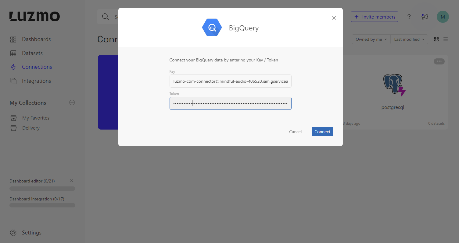 Navigate to the Connections page, select New Connection, then select the BigQuery from the New Connection modal. You'll be asked to provide a key and token. Copy these verbatim from the JSON file:
