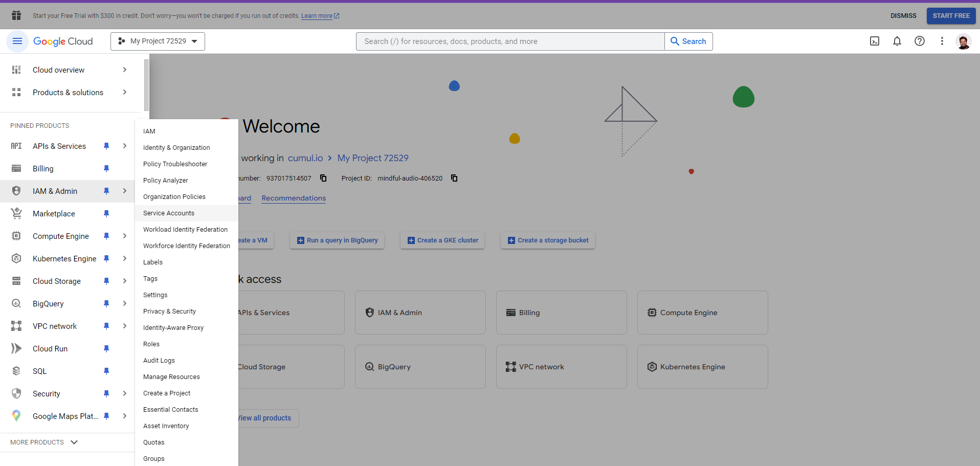 Go to Google Cloud Console and select IAM & admin tab from the left menu. Click on Service accounts from the list.